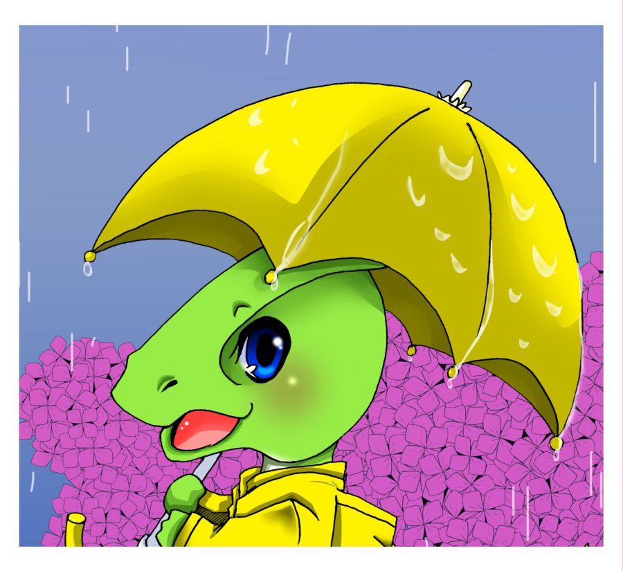 梅雨の時期と言うことで、傘さして歩いている「きょうりゅう☆きっず」を描いています。